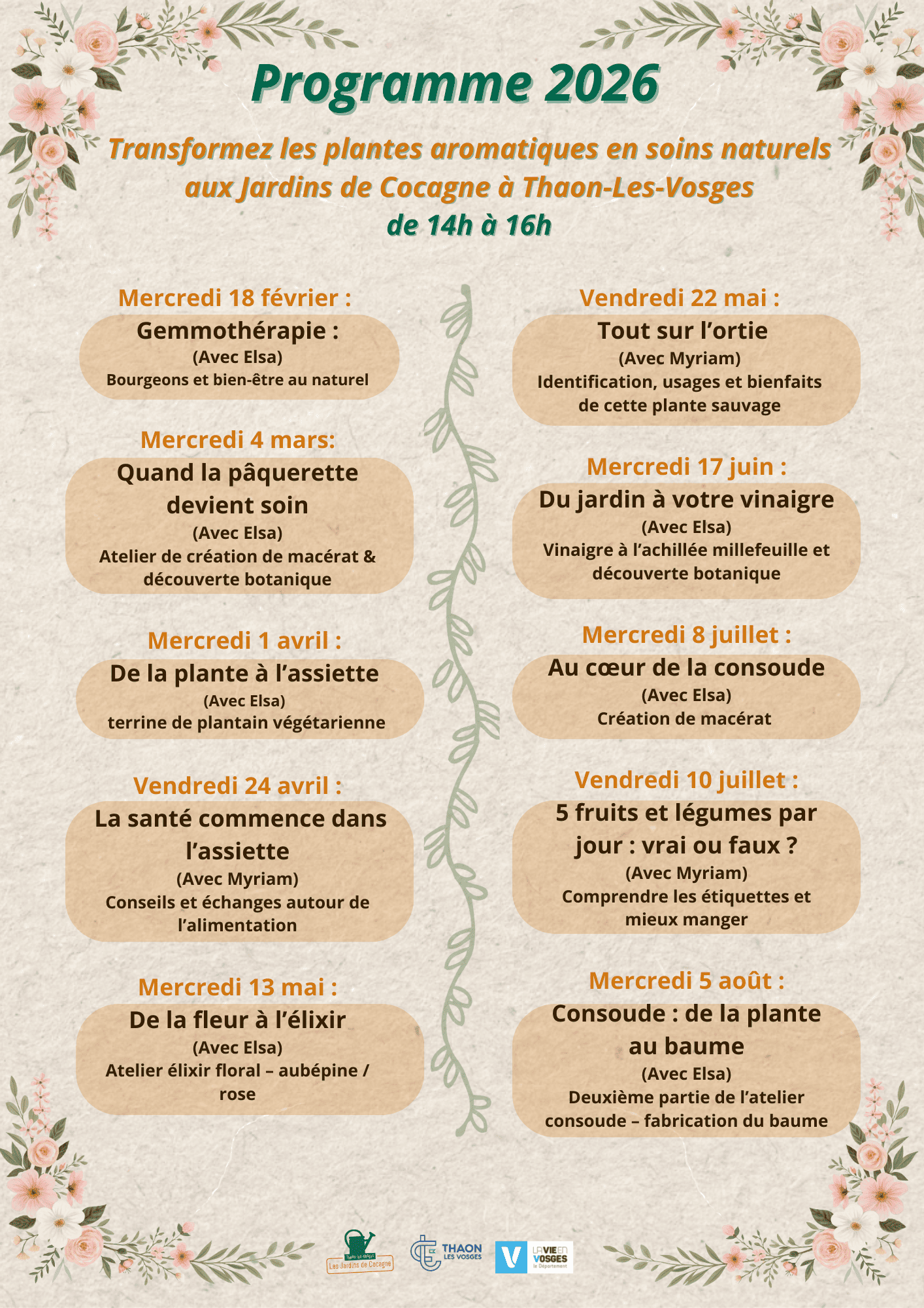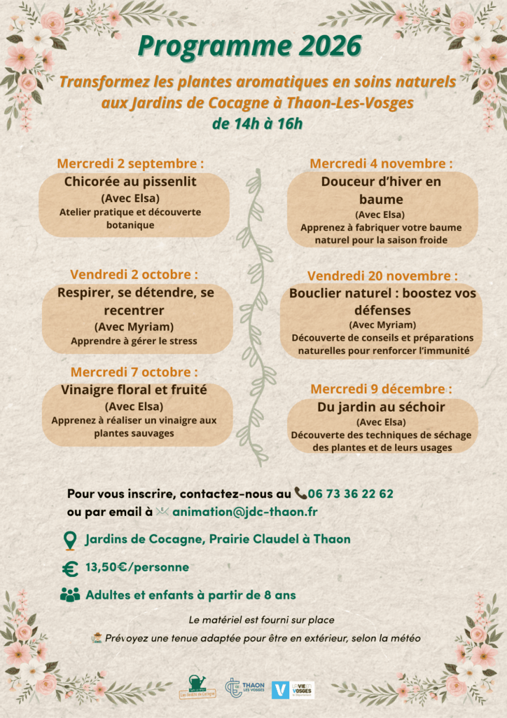 Note importante : certains ateliers peuvent ĂȘtre amenĂ©s Ă changer en fonction de la mĂ©tĂ©o et de la disponibilitĂ© rĂ©elle des plantes au moment prĂ©vu. Vous en serez bien Ă©videmment informĂ©s en amont.