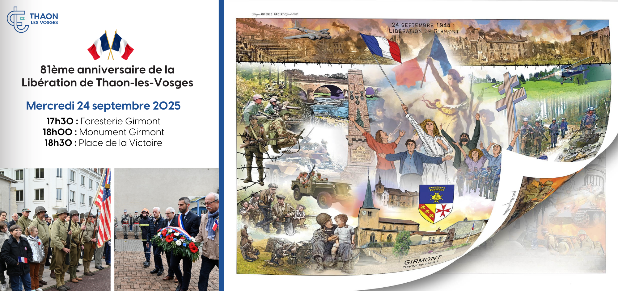 À l’occasion du 81e anniversaire de la Libération de Thaon-les-Vosges, la municipalité convie la population à participer aux cérémonies commémoratives qui se tiendront le mercredi 24 septembre 2025.