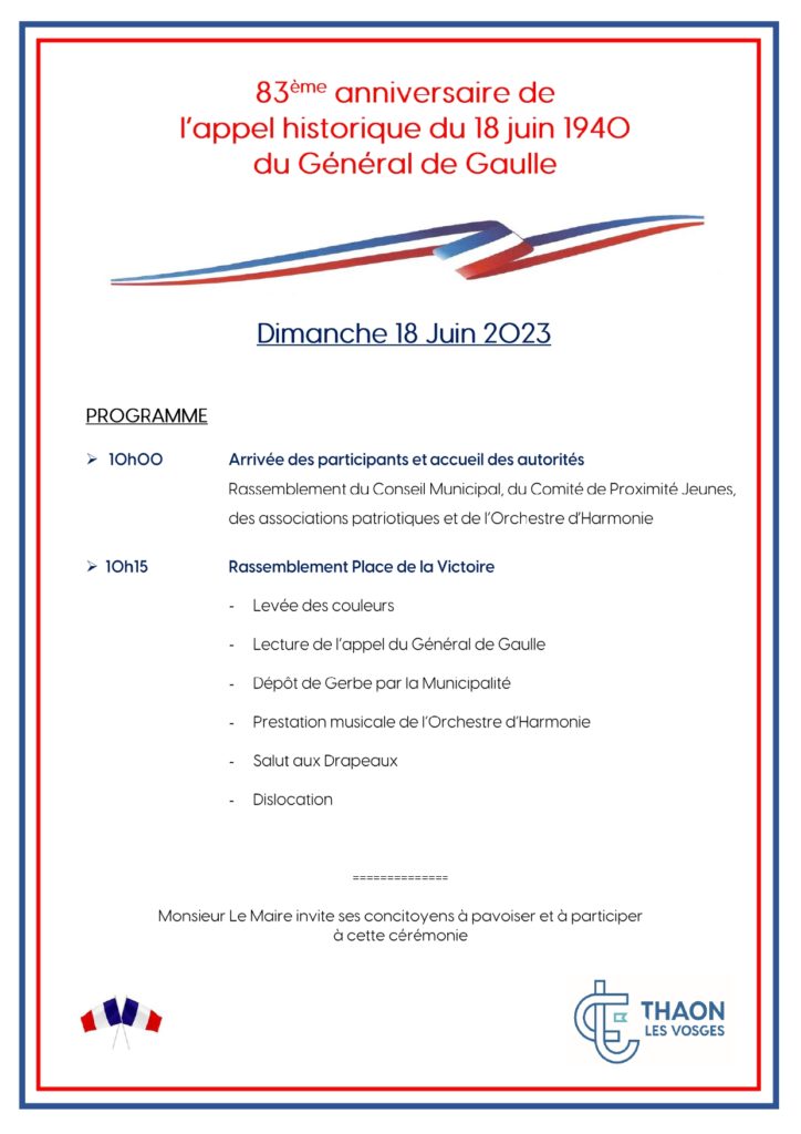 Dimanche 18 juin aura lieu le 83ème anniversaire de l’appel historique du 18 juin 1940 du Général de Gaulle. À partir de 10h15, une cérémonie se tiendra place de la Victoire.