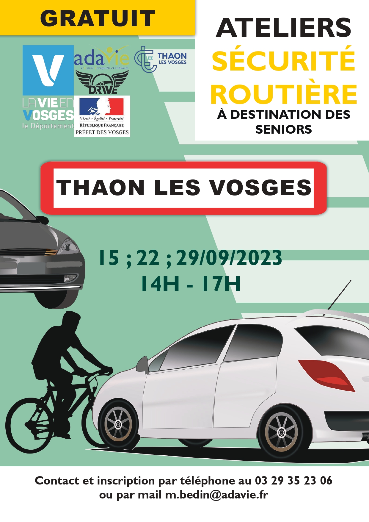 L’association Adavie, en partenariat avec l’école de conduite Drive, le Conseil départemental des Vosges et la Préfecture des Vosges, organisera des ateliers de prévention routière les 15, 22 et 29 septembre de 14h à 17h.