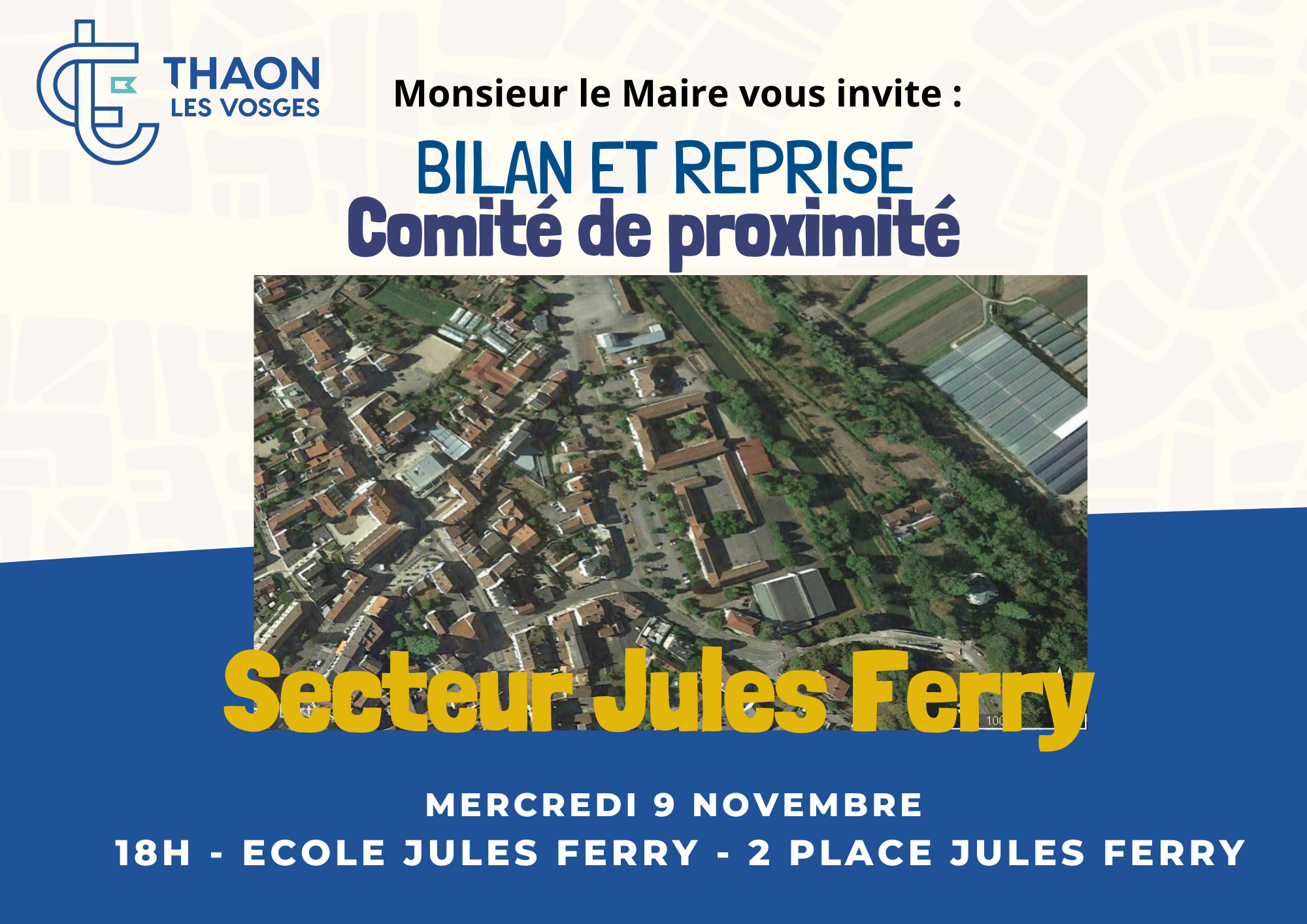 Le bilan du Comité de Proximité consacré au secteur Jules Ferry se tiendra mercredi 9 novembre prochain à 18h au sein de l’école Jules Ferry, située 2 place Jules Ferry. Les riverains de ce quartier sont invités à y assister !