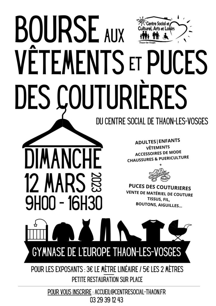 Le Centre Social et Culturel Arts et Loisirs organisera sa bourse aux vêtements et puces des couturières ce dimanche 12 mars de 9h30 à 16h30 au gymnase de l’Europe !