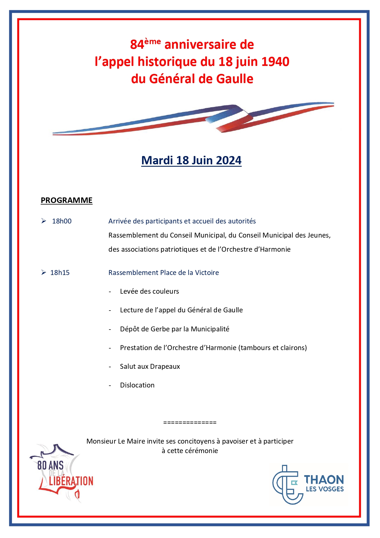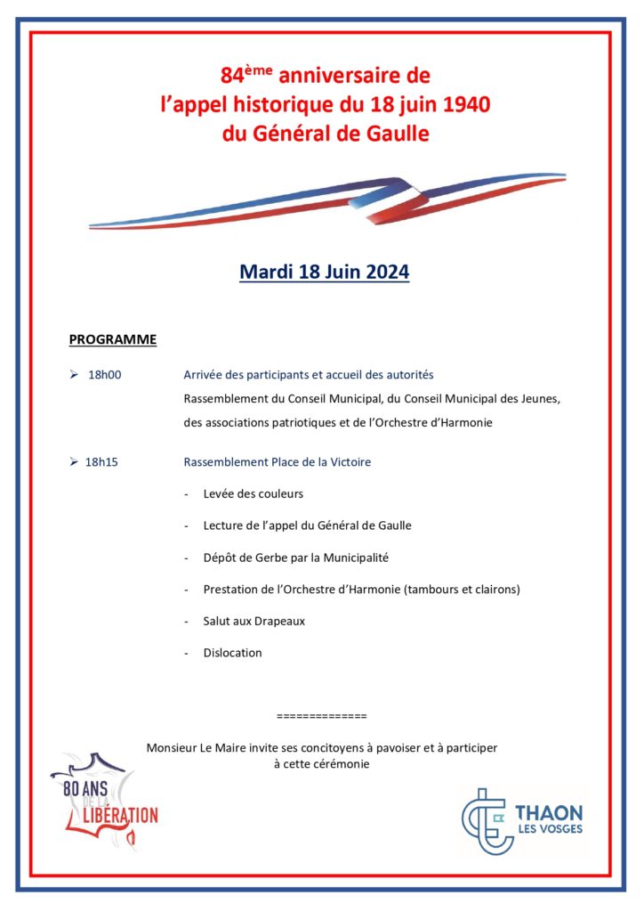 La cérémonie du 84ème anniversaire de l’appel historique du 18 juin 1940 du Général de Gaulle aura lieu le mardi 18 juin prochain à partir de 18h15 place de la Victoire.