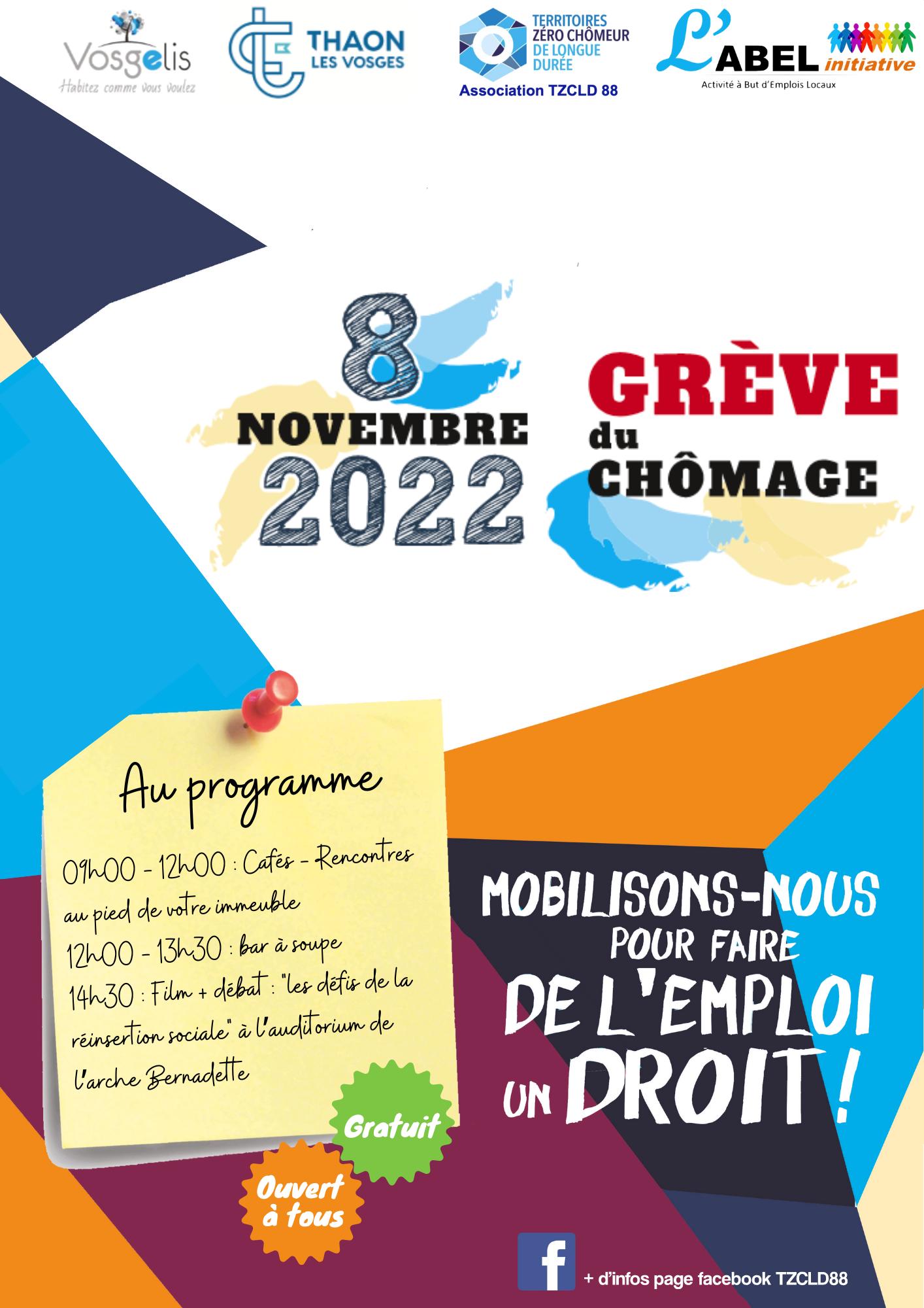 Mardi 8 novembre prochain aura lieu la Grève du chômage à Thaon-les-Vosges. La ville se mobilisera aux côtés de nombreux autres territoires pour faire de l’emploi un droit. La Grève du chômage est un rendez-vous annuel organisé par les territoires engagés dans la démarche Territoires Zéro Chômeur de Longue Durée 88. Cet événement symbolique, organisé pour la 7ème fois, vise à alerter et mobiliser contre la privation d’emploi et revendiquer le droit d’obtenir un emploi inscrit dans la Constitution Française !