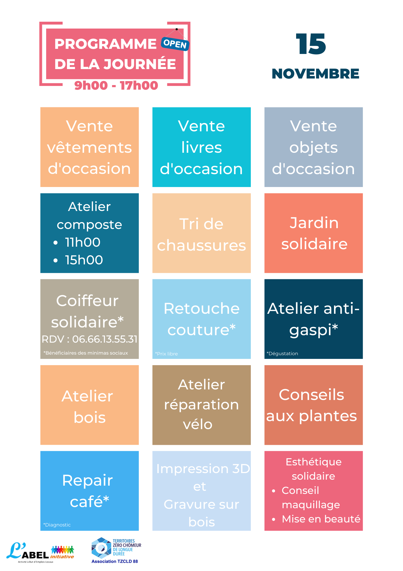 • De 9h à 17h : porte ouverte – Présentation des activités de la future Entreprise à But d’Emploi L’ABEL initiative (2 sites : 2 place Jules Ferry et 45 rue de Lorraine) et dégustation des préparations de l’atelier de transformation