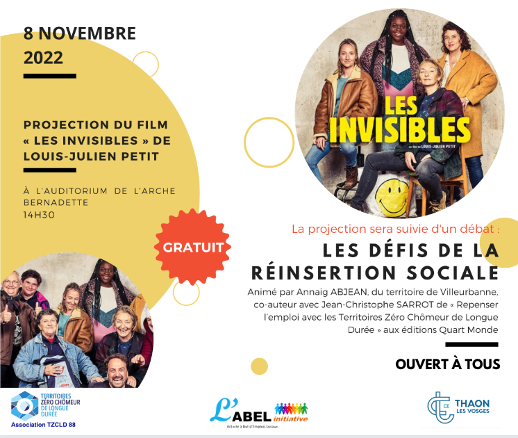 • De 14h30 à 16h30 : projection du film «Les invisibles» de Louis-Julien Petit à l’auditorium de l’Arche Bernadette