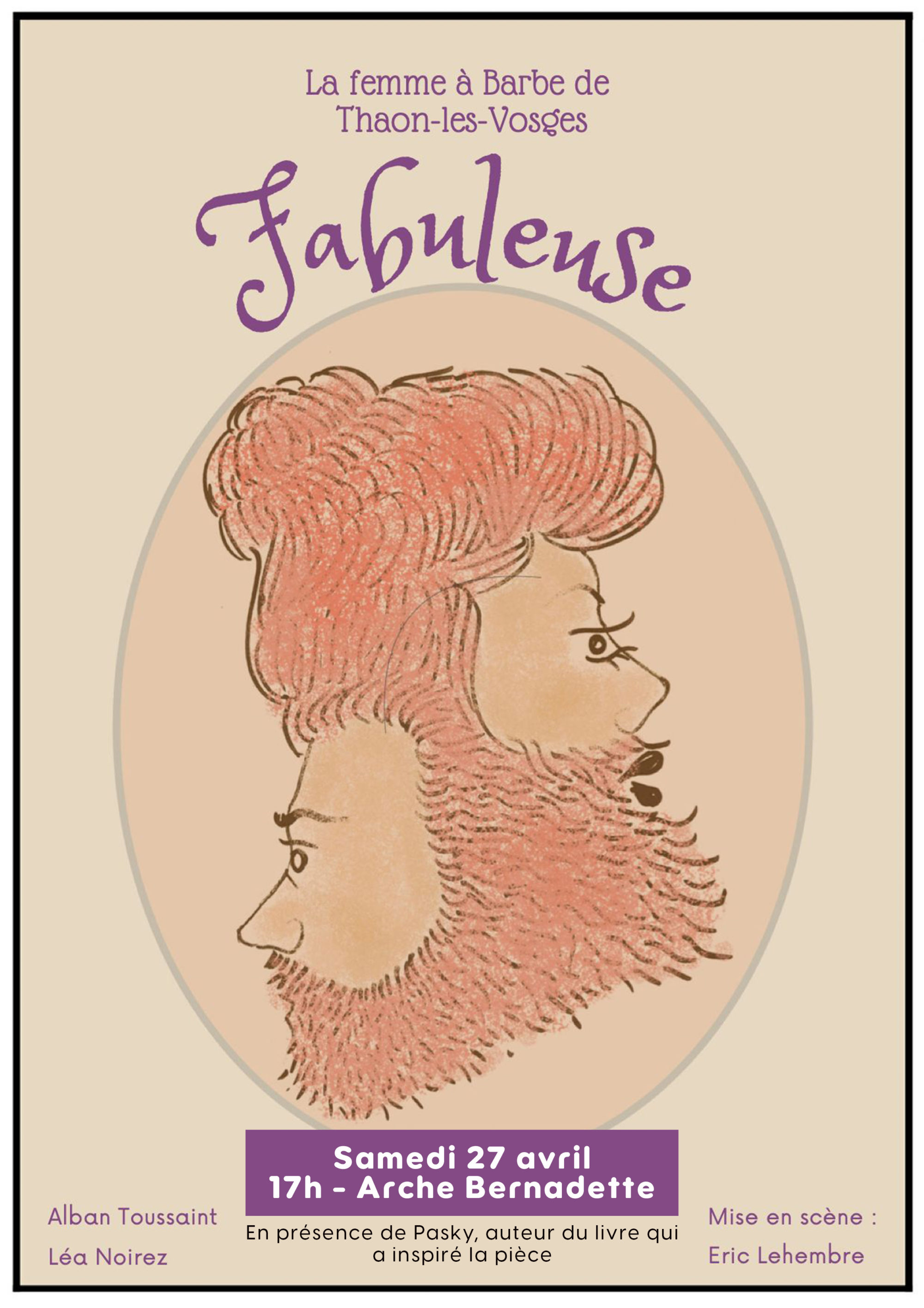 Ce samedi 27 avril à partir de 17h à l’auditorium de l’Arche Bernadette, ne manquez pas la représentation théâtrale de «Fabuleuse» (45 minutes tout public) sur la vie de notre femme à barbe thaonnaise Clémentine Delait en présence de Pasky, auteur du livre qui a inspiré la pièce. Avant la représentation, à 16h30, participez à un échange avec Yannick Thomas, auteur de l’ouvrage «Les femmes à barbe en France, 1850-1939, une approche genrée».