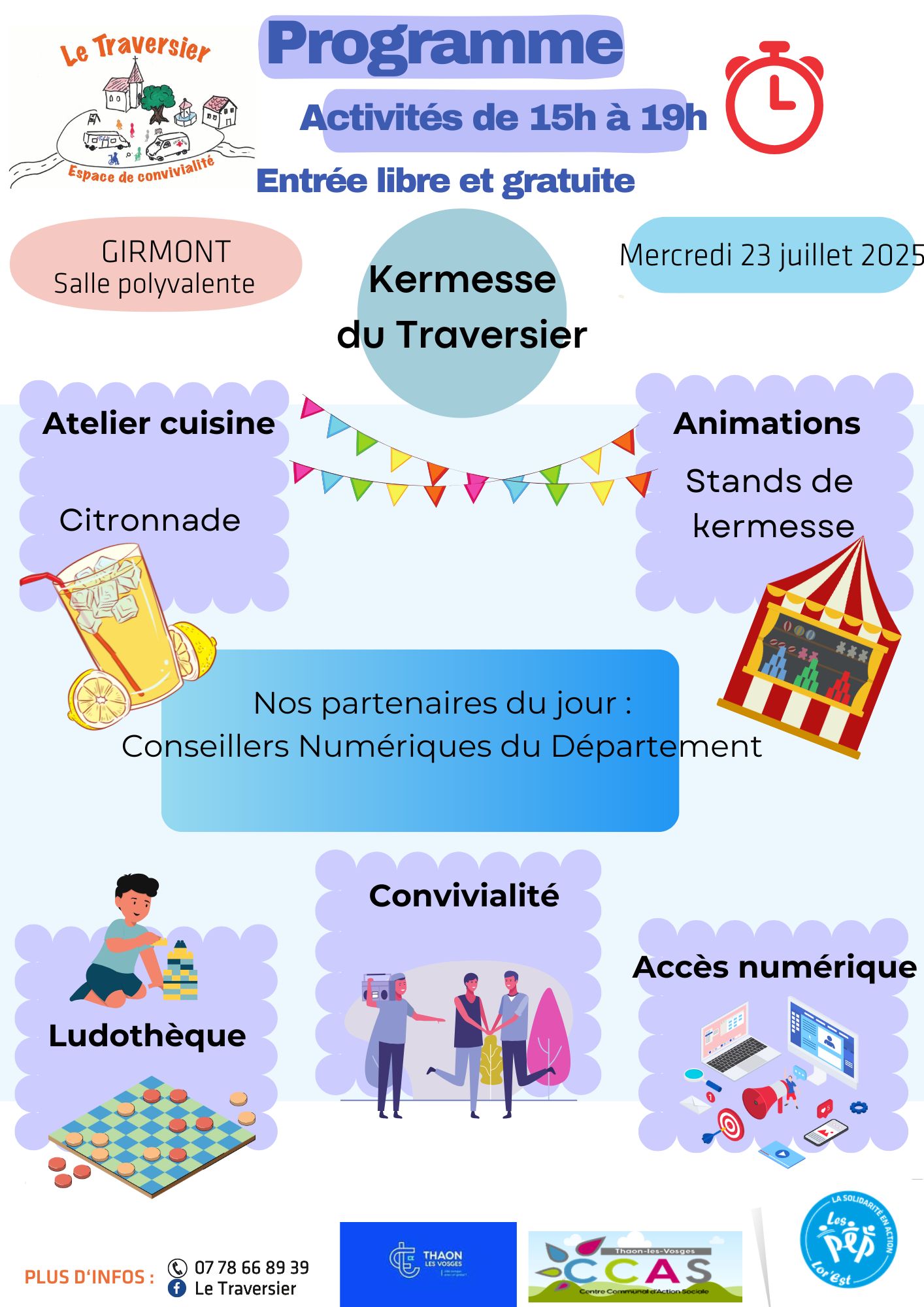 Rendez-vous le mercredi 23 juillet 2025, de 15h à 19h, à la salle polyvalente de Girmont. De nombreuses activités seront proposées : ludothèque, accès numérique, atelier cuisine, jeux de kermesse, citronnade et temps de convivialité.