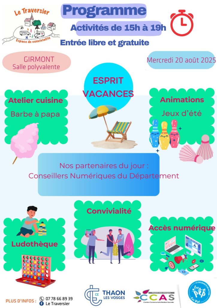 Retrouvez Le Traversier le mercredi 20 août 2025 de 15h à 19h à la salle polyvalente pour un après-midi placé sous le signe de l’esprit vacances 🏖️