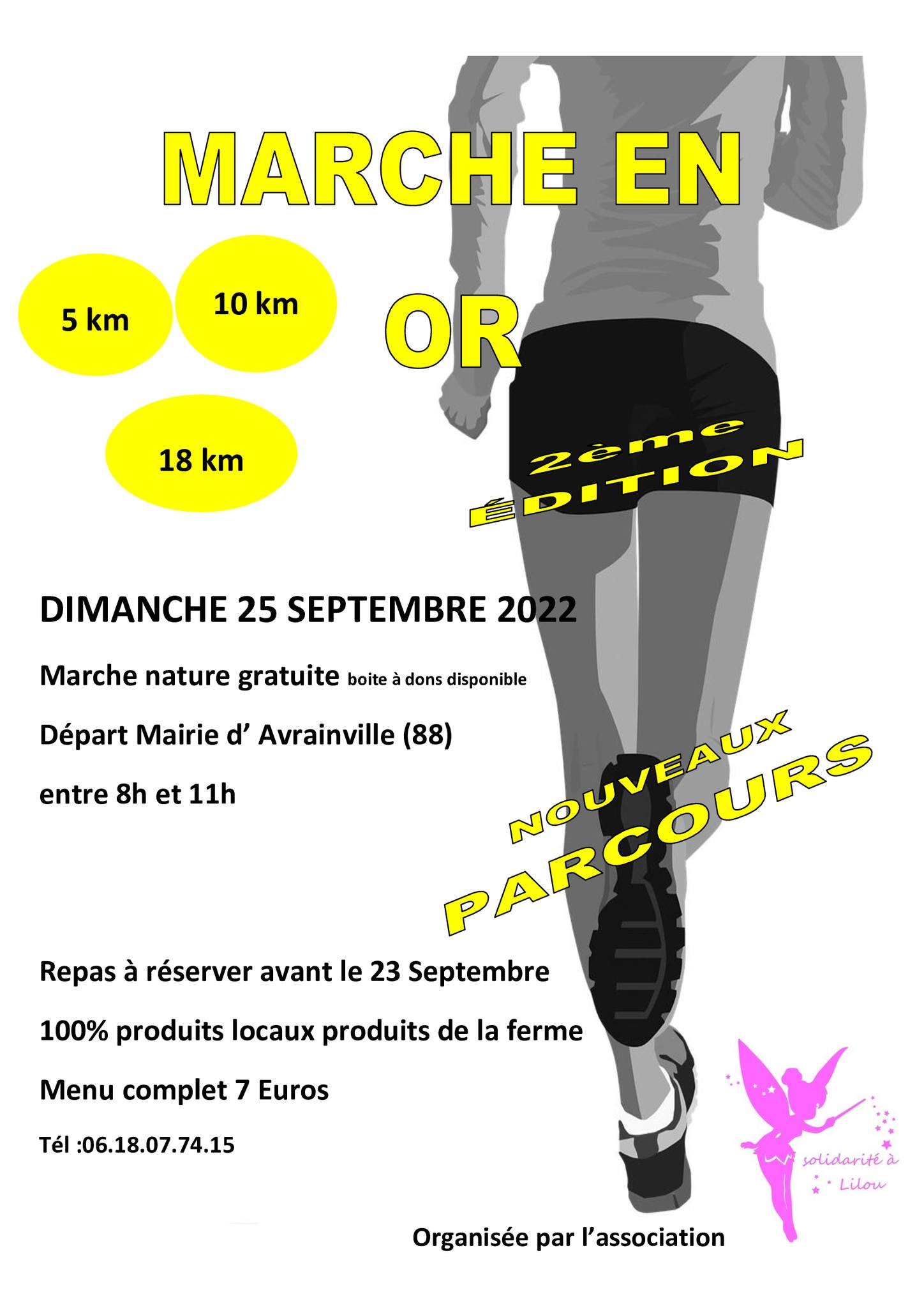 L’association Solidarité à lilou association organise une marche en or dimanche 25 septembre au départ de la mairie d’Avrainville (88) entre 8h et 11h. Pour cette deuxième édition, des parcours de 5,10 et 18 kilomètres seront disponibles.