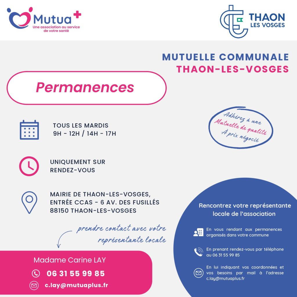 Où se renseigner ? Vous trouvez que votre mutuelle est trop chère ? Qu’elle n’offre pas toutes les garanties dont vous avez vraiment besoin ? Ou que vous êtes mal remboursé ? Demandez des renseignements lors des permanences prévues tous les mardis (9h-12h/14h-17h) à compter du mardi 19 septembre 2023 à la mairie de Thaon-les-Vosges, bureau situé à l’entrée du CCAS, uniquement sur rendez-vous. Ces permanences seront organisées par votre représentante, Madame Carine LAY, afin de répondre à vos attentes en toute confidentialité !