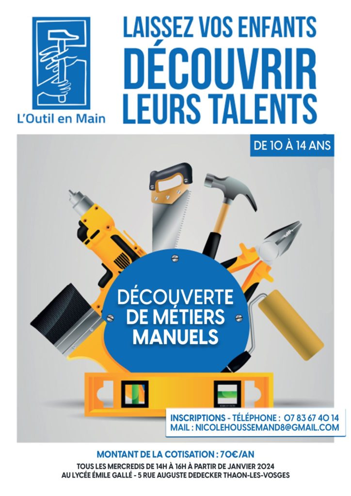 Pour sa première année d’ouverture, et à partir de janvier 2024, l’Outil en Main va accueillir une dizaine d’enfants. Les ateliers se dérouleront chaque mercredi (hors vacances scolaires) de 14h à 16h, au sein d’un local dédié situé au Lycée Professionnel Emile Gallé. Les élèves, en binôme avec des retraités passionnés, découvriront successivement les différents corps de métiers à raison de 6 heures de pratique par métier.