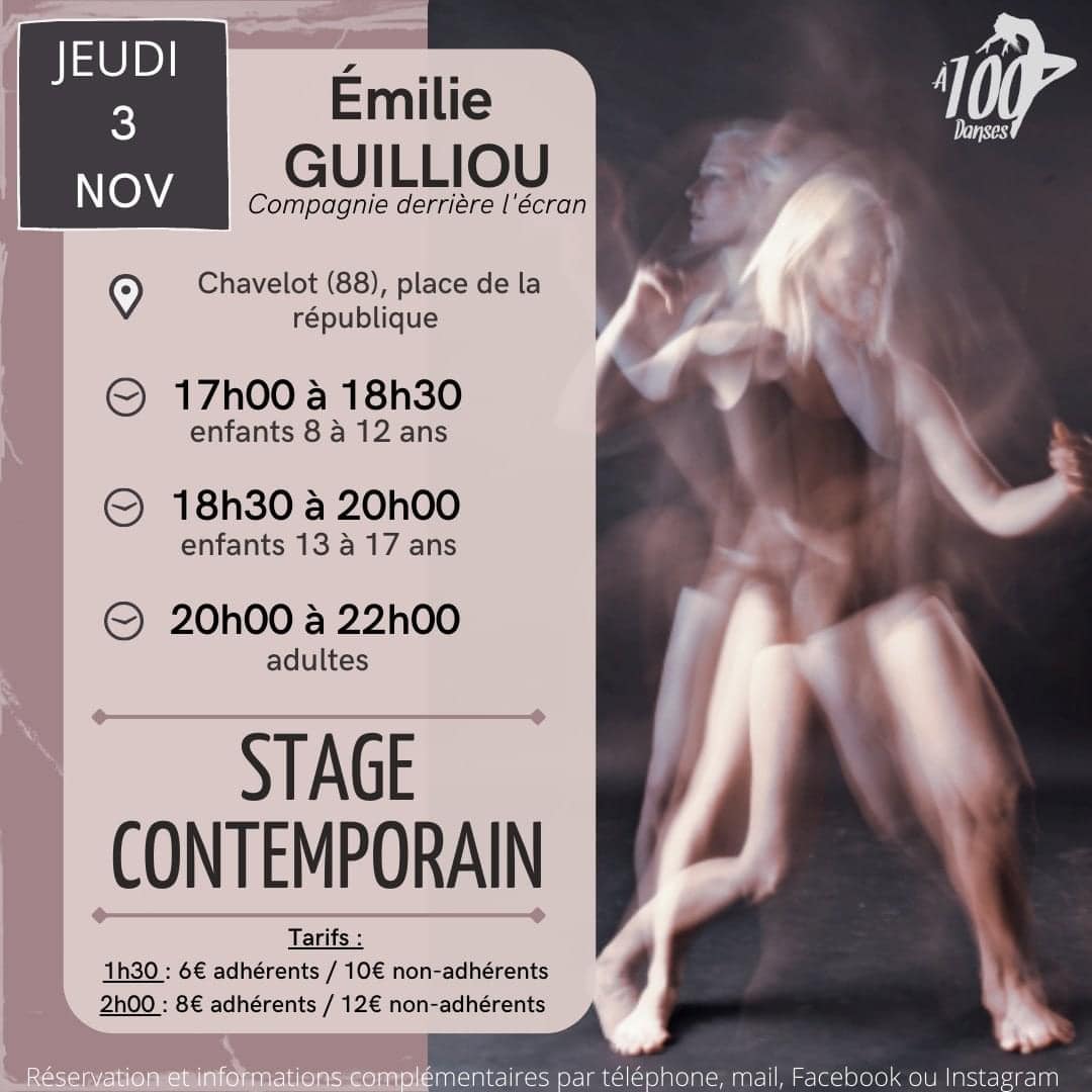 Jeudi 3 novembre, l’association À 100 danses organisera son premier stage de contemporain avec Émilie Guilliou, danseuse chorégraphe de la compagnie Derrière l’écran.