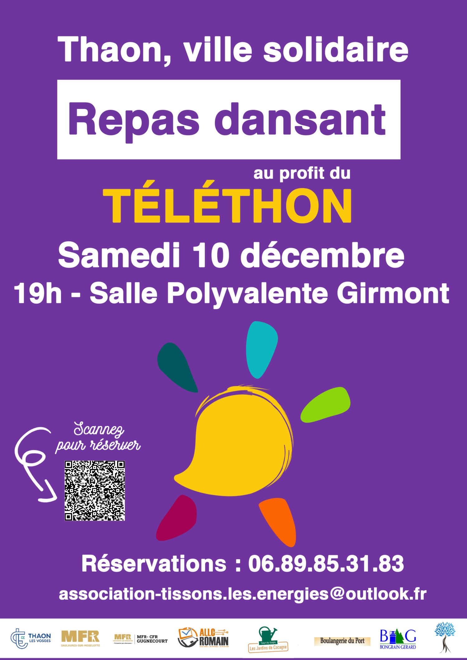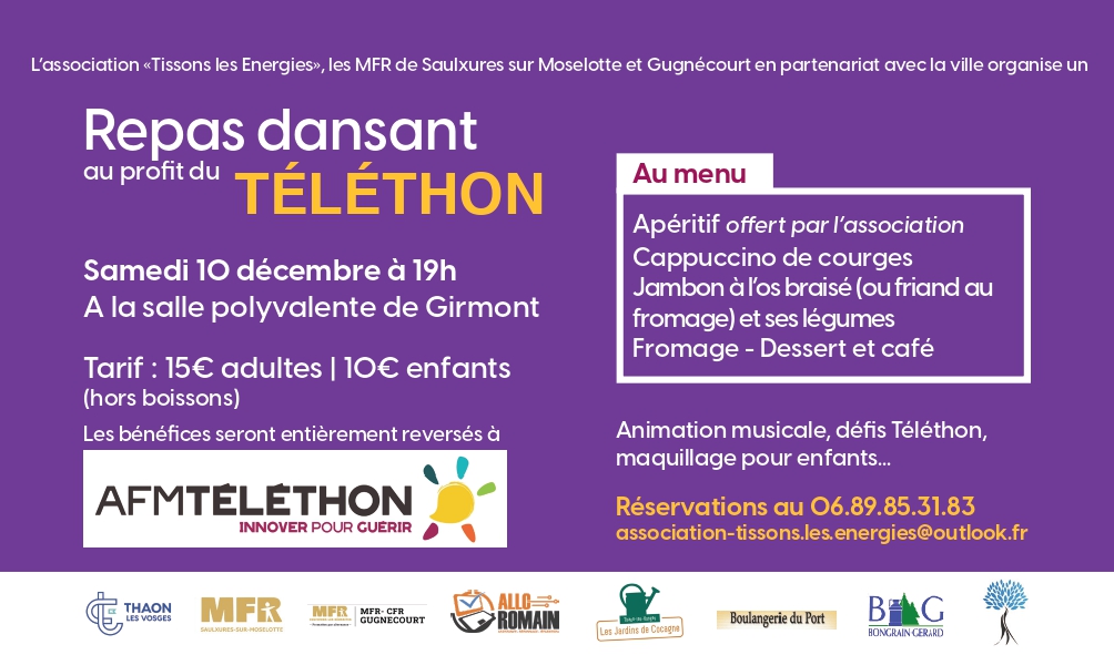 L’association Tissons les énergies, les MFR de Saulxures-sur-Moselotte et Gugnécourt en partenariat avec la ville organiseront un repas dansant au profit du Téléthon samedi 10 décembre à 19h en salle polyvalente de Girmont. (30 rue Abbé Vincent)