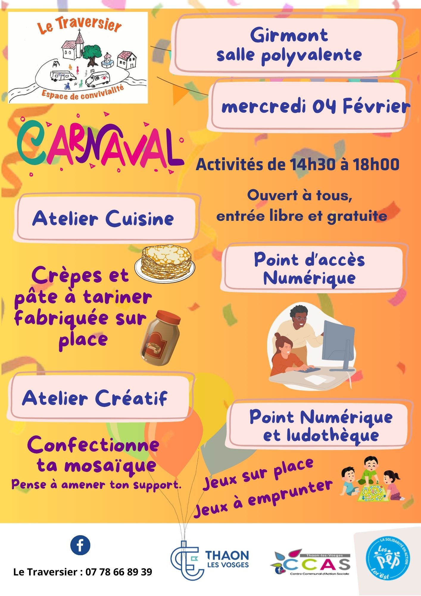 L’espace de convivialité Le Traversier fait son retour et vous invite à partager un après-midi festif, créatif et gourmand à l’occasion du Carnaval.