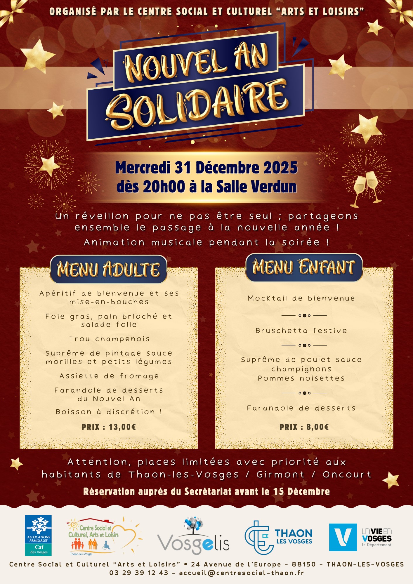 Pour clôturer l’année dans la convivialité et la bonne humeur, le centre social et culturel Arts et Loisirs organise un Réveillon du Nouvel An Solidaire le 31 décembre 2025, dès 20h à la salle Verdun de Thaon-les-Vosges.