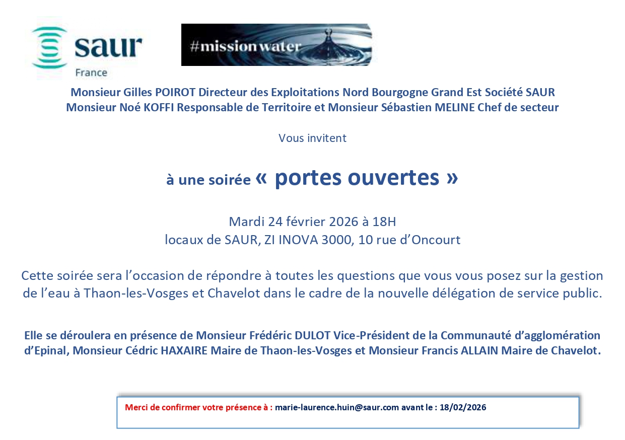 💧 La SAUR vous invite à une soirée portes ouvertes consacrée à la gestion de l’eau dans le cadre de la nouvelle délégation de service public.