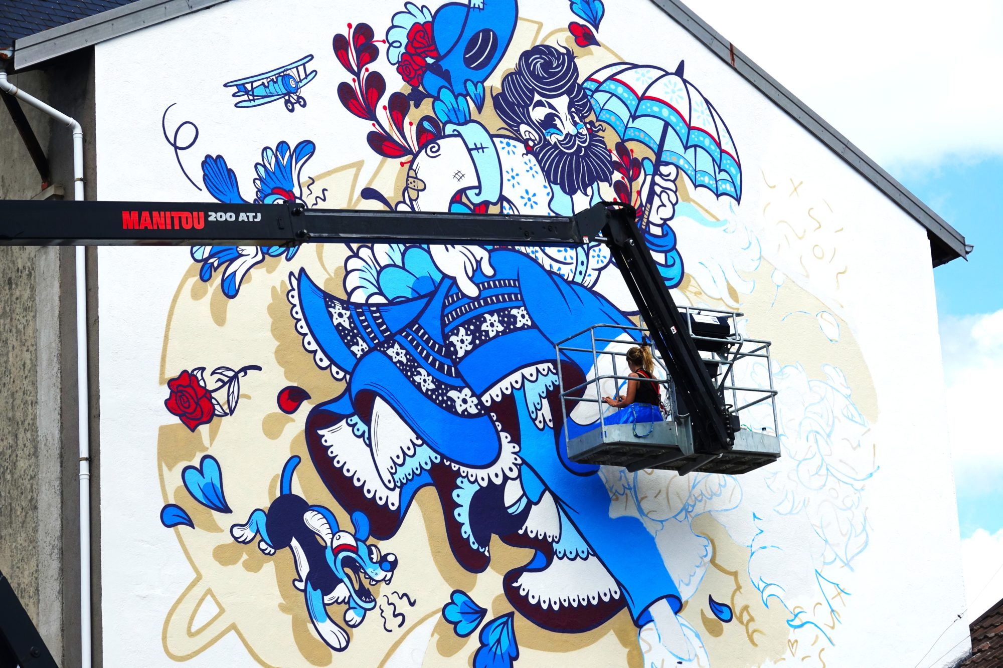 J’aime la plupart du temps me renseigner sur le lieu où je peins. Parfois selon mes envies il m’arrive de peindre mon univers sans prendre un seul élément de l’endroit où je peins. C’est vraiment au ressenti. Mais c’est comme ça que lors de ma fresque faite en 2022 à Raon-l’Etape, j’avais eu la volonté de peindre la femme à barbe, mais j’avais découvert qu’elle n’était pas originaire de cette ville, et n’y avait pas vécu non plus. C’était en évoquant ce scénario avec l’adjoint à la ville qu’il m’a dit qu’il connaissait le maire de Thaon-les-Vosges… et le soir j’avais reçu un courriel dans ma boîte de monsieur le Maire !
